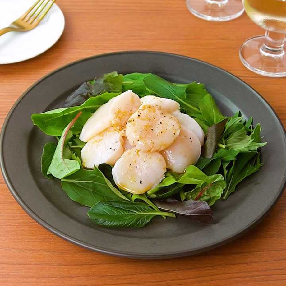 器にベビーリーフを盛り、ホタテをのせて和風ドレッシングをかける。