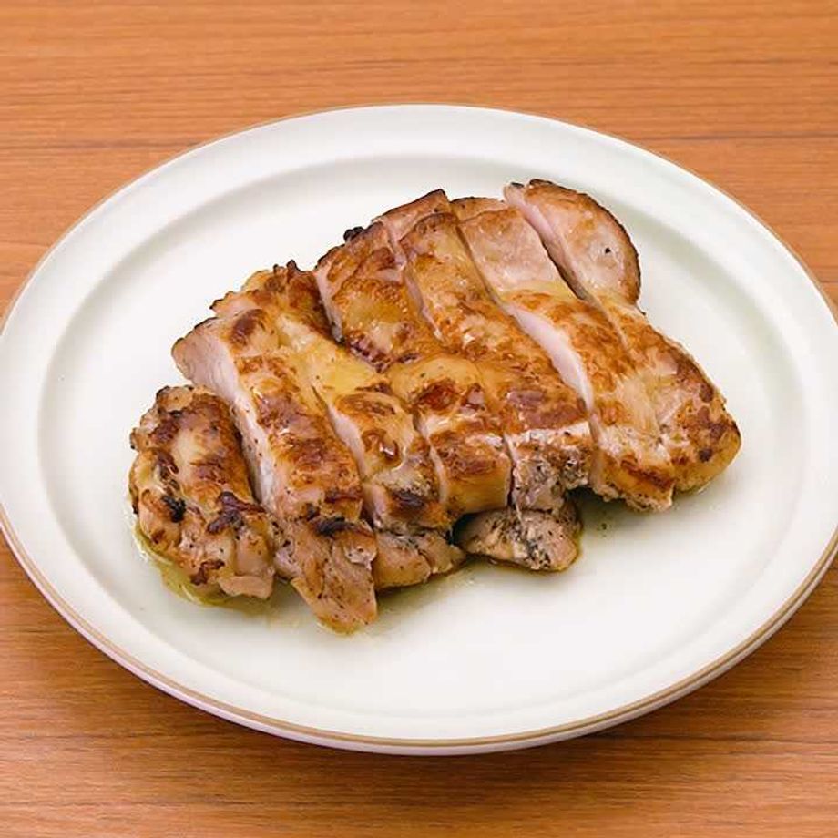 フライパンにオリーブオイル、にんにくを入れて弱火で熱し、きつね色になるまで炒めて取り出す。鶏肉の皮目を下にして入れ、こんがりと焼き色がつくまで中火で焼く。裏に返し、ふたをして肉に火が通るまで弱火で5分ほど蒸し焼きにする。ふたを取り、カリッとするまで焼いて取り出す。
