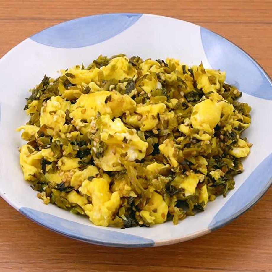 ごま油を入れて中火で熱し、高菜漬けを入れて1分ほど炒める。炒り卵を戻し入れ、しょうゆ、白いりごまを加える。炒り卵を大きくくずしながら全体をさっと炒める。