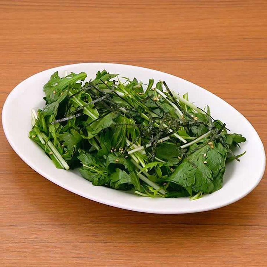 春菊と水菜がシャキッとおいしいサラダレシピ!のりとごま油の香りが食欲をそそり、おつまみにもなる一品です♪【減塩対策対応レシピ】※減塩対策ついてはQ&Aをご参照ください。