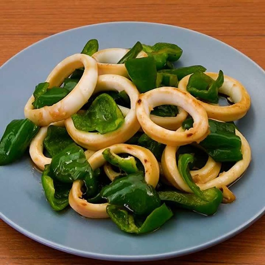 フライパンにサラダ油を入れて中火で熱し、イカを入れて色が変わるまで手早く炒める。ピーマンを加えて油がなじむまで炒める。酒、バター、しょうゆを加えてさっと炒める。