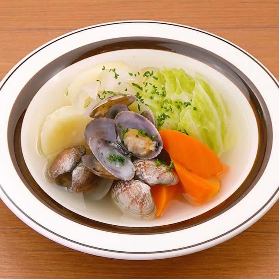 - 4 - 3の鍋にじゃがいも、玉ねぎ、にんじん、キャベツ、水を入れて中火にし、煮立ったらふたをする。じゃがいもがやわらかくなるまで弱火で12分ほど煮る。蒸し汁ごとあさりを戻し入れる。塩、こしょうを加えてさらに2〜3分ほど煮る。 - ポイント - あさりの塩分によって塩の分量は調整してお作りください。