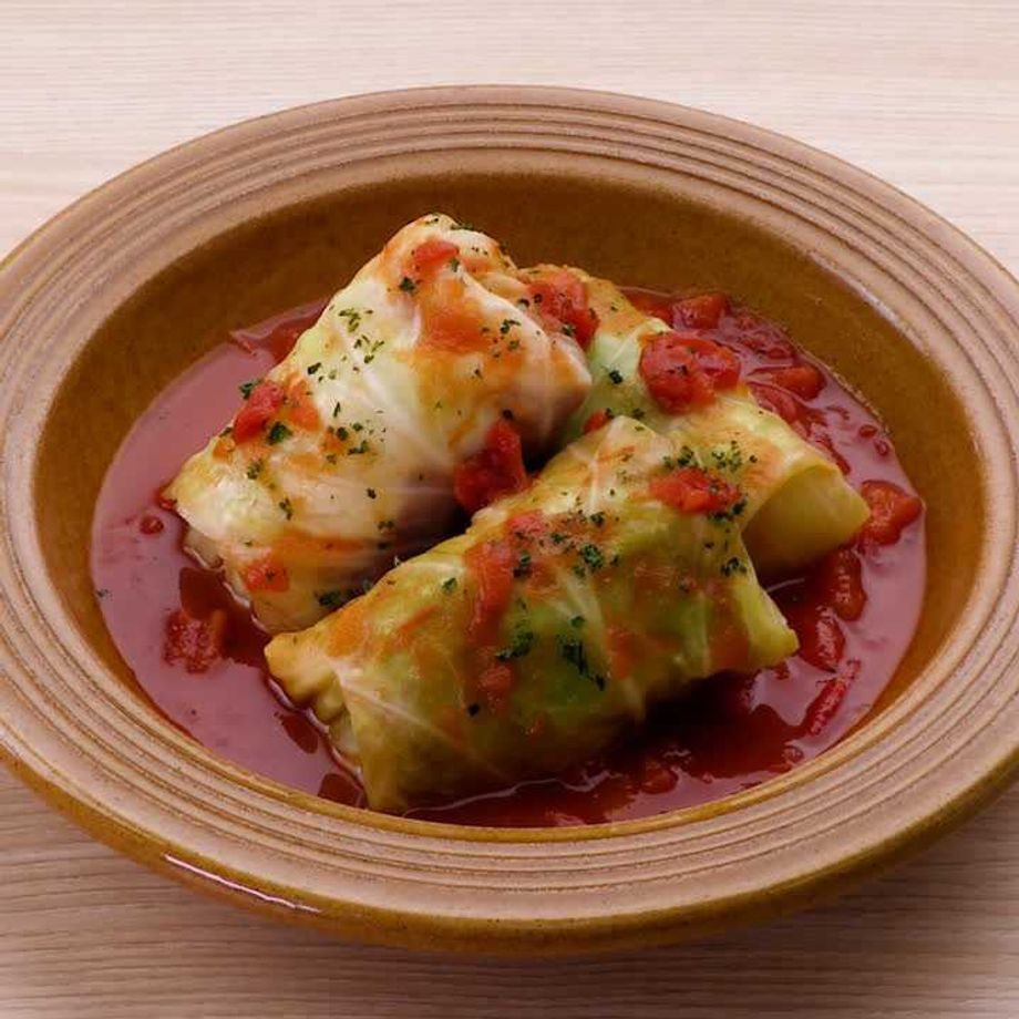 耐熱容器にキャベツ、水(分量外:大さじ1)を入れてふんわりとラップをし、600Wのレンジで3分柔らかくなるまで加熱する。粗熱をとり、キッチンペーパーで水気をふきとる。芯はめん棒などで叩く。