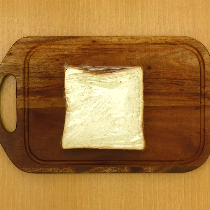 ラップを敷き、食パン1枚をバターをぬった面を上にしてのせる。えびとアボカドのサラダを半量のせ、全体に広げる。食パンをバターをぬった面を下にしてのせてはさみ、ラップで包んで5分ほどおいてなじませる。同様に計2個作る。