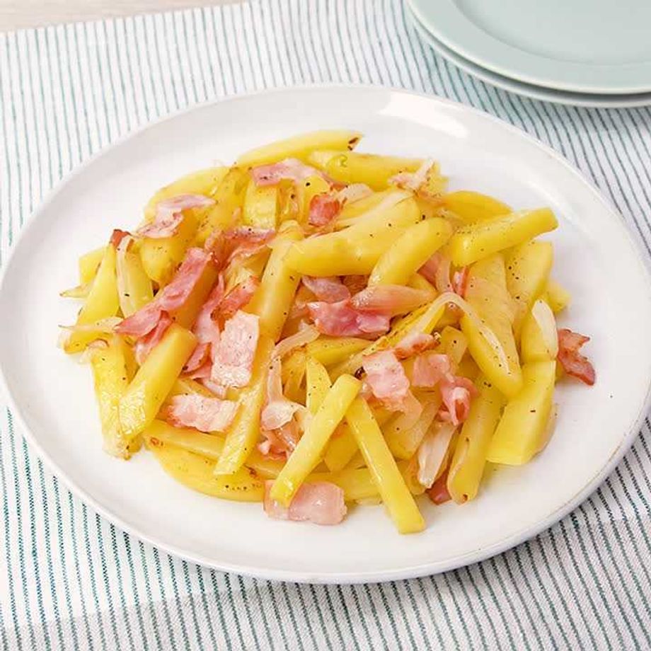 材料はベーコン、じゃがいも、玉ねぎとシンプルな炒め物のレシピをご紹介します。パパッとお家にある食材で作れるので時間がない時におすすめですの一品♪