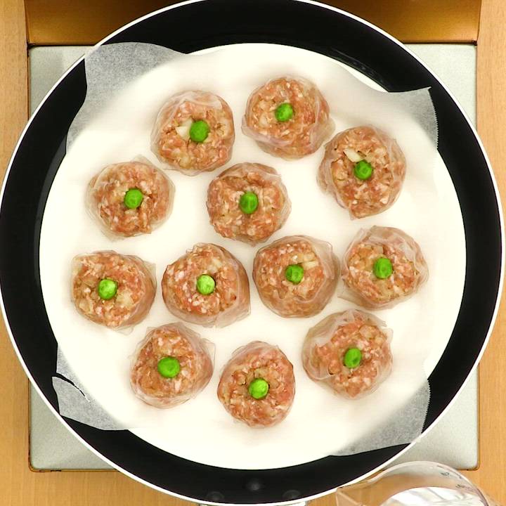 フライパンに入る大きさの耐熱皿にクッキングシートを敷き、4の肉だねを並べてグリーンピースを1粒ずつのせる。フライパンに耐熱皿ごと入れてフライパンの底から2cm程度の水(分量外:適量)を注ぐ。ふたをして中火で熱し、蒸気が上がったら肉に火が通るまで弱火で7〜8分蒸す。