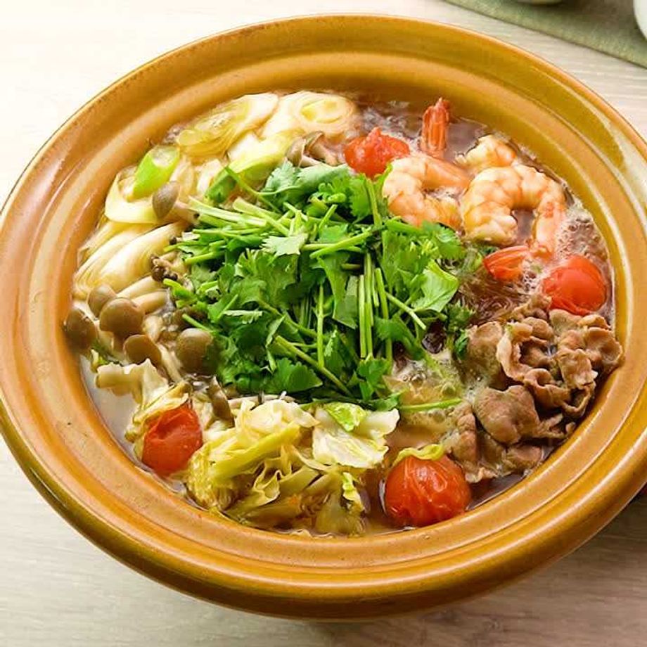 鍋に☆を入れて中火で熱し、軽く混ぜる。煮立ったら豚肉を広げながら加え、アクを取り除く。再び煮立ったらえび、キャベツ、ねぎ、しめじ、ミニトマト、春雨を加える。再び煮立ったらふたをして弱火で4〜5分具材に火が通るまで煮る。ふたを取り、パクチーを加えてさっと煮る。