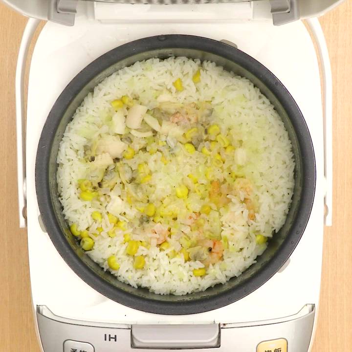 炊飯器の内釜に米、☆、水を2合の目盛り2mm下まで入れて混ぜ、米を平らにならす。玉ねぎ、コーン缶、シーフードミックスをのせて広げ、バターをのせて通常炊飯する。