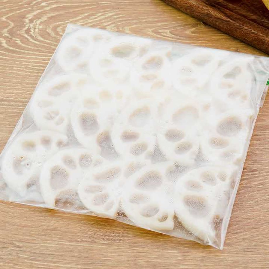 冷凍用保存袋にれんこんを広げて入れ、空気を抜きながら袋の口を閉じ、冷凍室に横にして入れる。