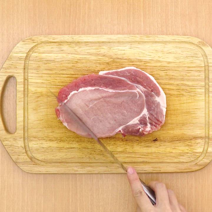 肉が分厚く、下まで刺しづらい場合は両面筋切りをしましょう。豚ロース(とんかつ用)以外に、生姜焼き用や薄切り肉、豚肩ロース肉の場合でも同じように筋切りすることで柔らかく仕上がります。