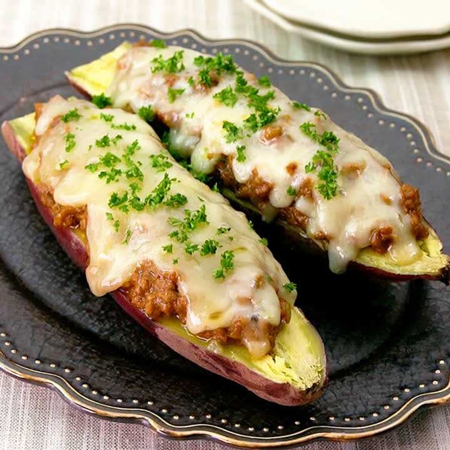 アルミホイルを敷いた天板に焼き芋の断面を上に向けて置き、キーマカレーを等分にのせ、ピザ用チーズを等分にのせる。