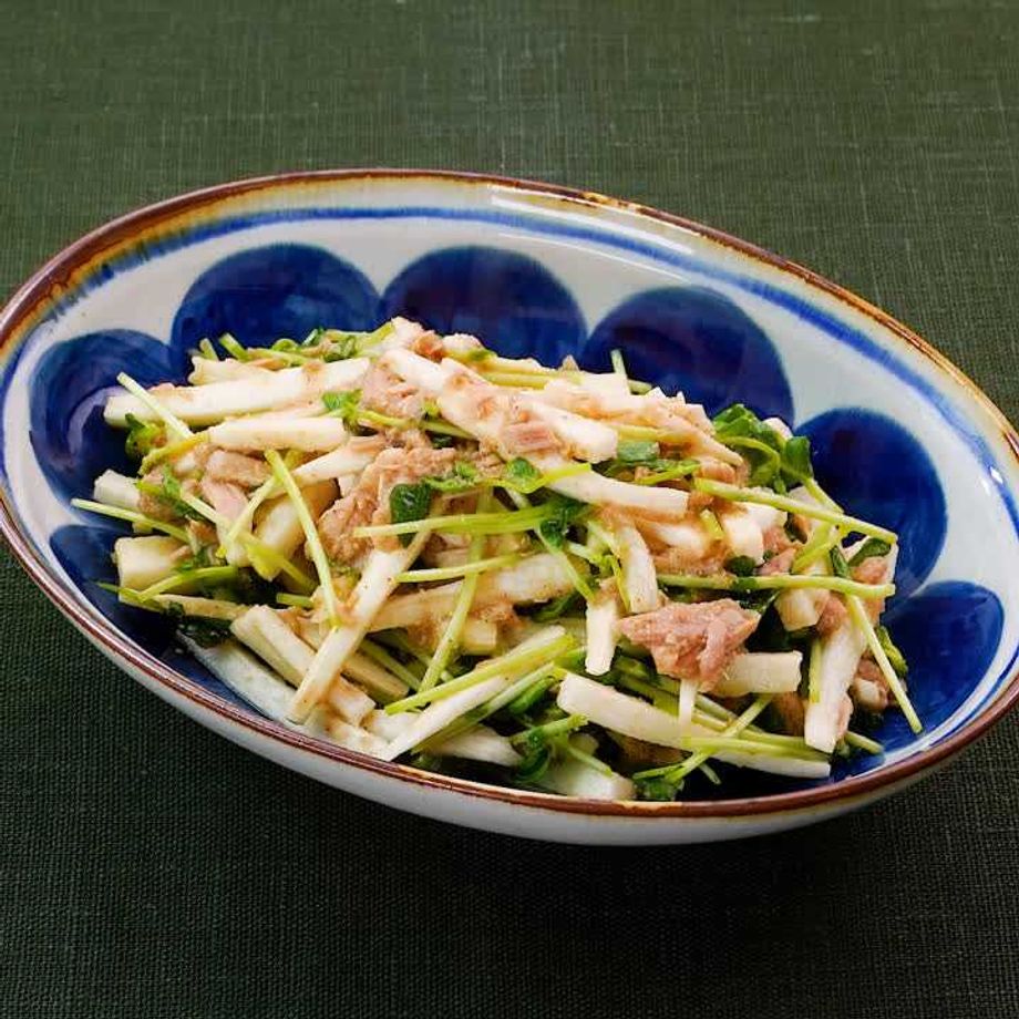 ボウルにツナ缶、ポン酢しょうゆ、しょうゆ、白すりごまを入れて混ぜる。長芋、豆苗を加えて混ぜる。