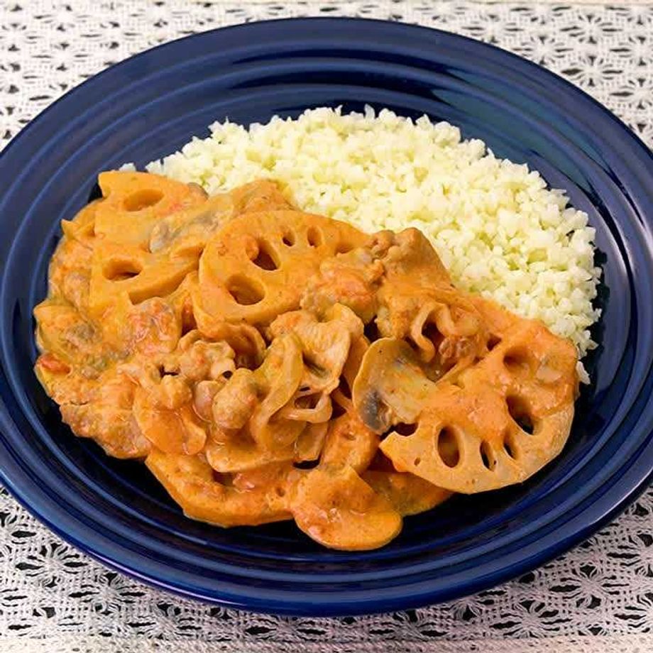 器にバターカリフラワーライス、れんこんのポークストロガノフを盛る。