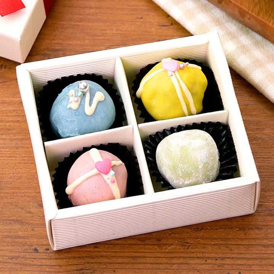 4等分にしたホワイトチョコレートにチョコレート用色素(赤,青,黄)をそれぞれ少量ずつ加え、混ぜる(カラーチョコレート)。