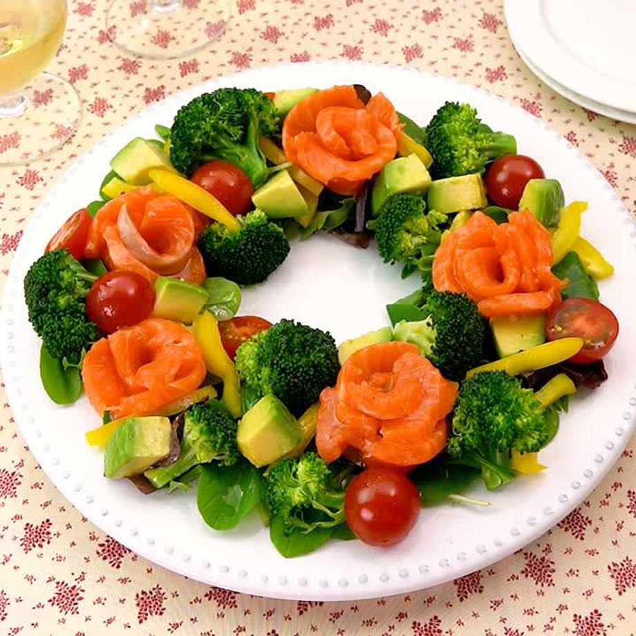 サーモンをお花に見立てた華やかなリースサラダをご紹介!日々のおもてなしメニューとしていかがですか?意外と手軽にできて見た目も豪華に仕上がるので、パーティーなどにもおすすめです。【減塩対策対応レシピ】※減塩対策についてはQ&Aをご参照ください。