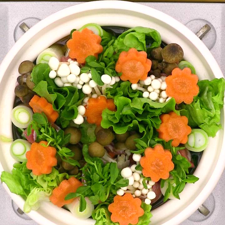 土鍋に残りの豆苗、食べやすく切ったにんじん、えのきの根元を底に平らになるように入れる。豆苗肉巻き、えのき肉巻き、しめじ肉巻き、ねぎ、グリーンリーフを彩りよく詰める。花形に抜いたにんじんをのせ、鍋スープを加えて中火で熱し、肉に火が通るまで加熱する。