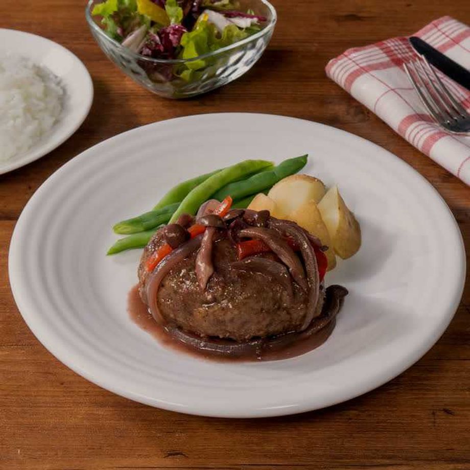 ハウス「濃い飴色の炒め玉ねぎ」を肉だねにもソースにも使うことで、コクのある味わいがダブルで楽しめます♪大きく作ることでお店のようなジューシーで本格的なハンバーグに!是非お試しください♪