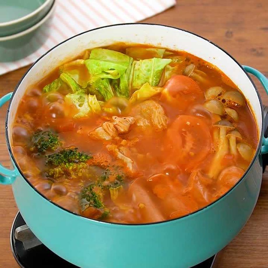 トマトの酸味と旨みが詰まった洋風鍋のご紹介です。市販の鍋の素は使わず、手軽な調味料で作ります。〆はごはんでもパスタでもおすすめ!お好みで粉チーズをちらしてお召し上がりください♪ 【減塩対策対応レシピ】※減塩対策についてはQ&Aをご参照ください。