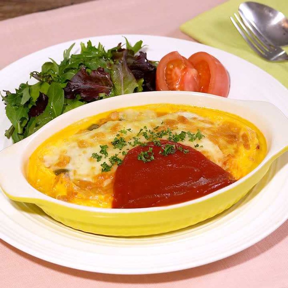 耐熱皿に半量のチキンライスを敷く。よつ葉3種のチーズ《濃厚コク旨ブレンド》、溶き卵の順に半量ずつのせる。同様に計2個作る。天板にのせてトースターで焼き色がつき、卵に火が通るまで10分ほど焼く。