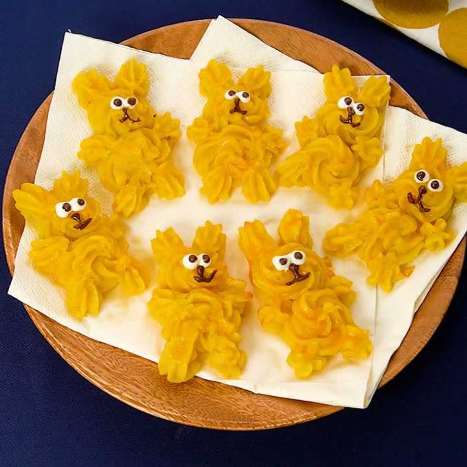 お月見らしいうさぎをモチーフにした絞り出しスイートポテト♪絞り袋でうさぎ型にしぼり出し、チョコペンで顔を描くのも楽しいポイント!お子様と一緒に作るのにもぴったりな、見た目もかわいいお月見スイーツです♪