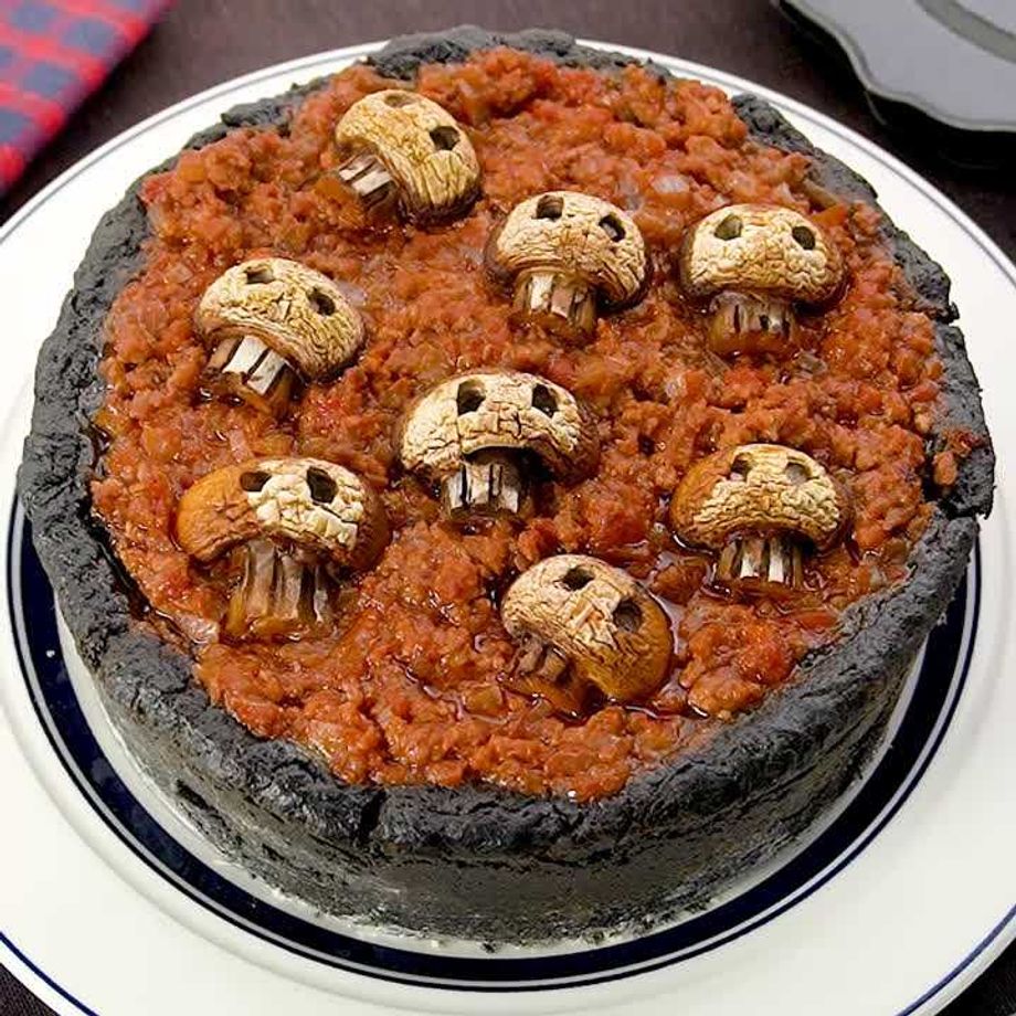 ハロウィンにぴったり!マッシュルームをドクロに見立てたチーズたっぷりのシカゴピザのレシピです。ハロウィンを一気に盛り上げてくれる存在感でテーブルにあるだけで思わず写真を撮りたくなります。みんなでシェアして食べましょう♪【減塩対策対応レシピ】※減塩対策ついてはQ&Aをご参照ください。
