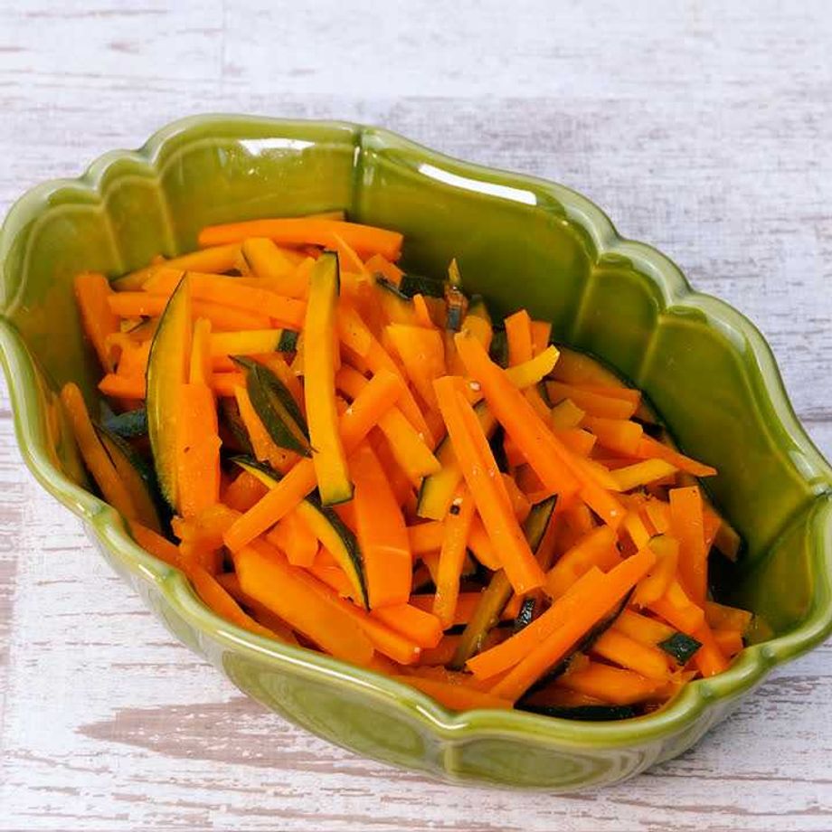 秋らしいかぼちゃとにんじんを使った、彩り鮮やかなラペです♪ 甘みのある野菜に酸味をきかせてさっぱりと仕上げました。彩りがよく食卓を明るくしてくれる副菜としてぴったりの一品です。 【本レシピはプレミアム献立用レシピです】プレミアム献立は管理栄養士が栄養バランスや塩分量を計算して、食のプロが献立を作成しています。主菜、副菜、汁物が揃ったプレミアム献立で本レシピを作るとより美味しく食べることができます。ぜひプレミアム献立で献立内容をチェックしてみてください。