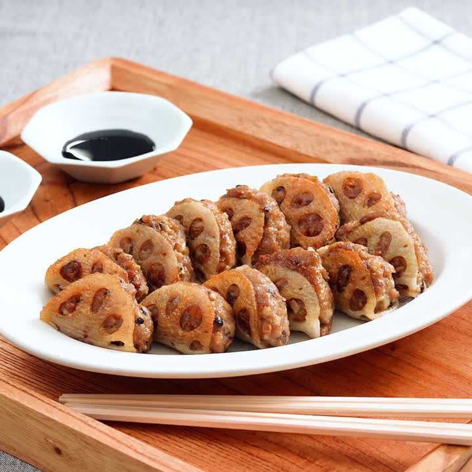 Aれんこんをスライスする際に1〜1.5mm厚を目安に切りましょう。また肉だねをのせる際は中央におき、やさしく包んでみてください。