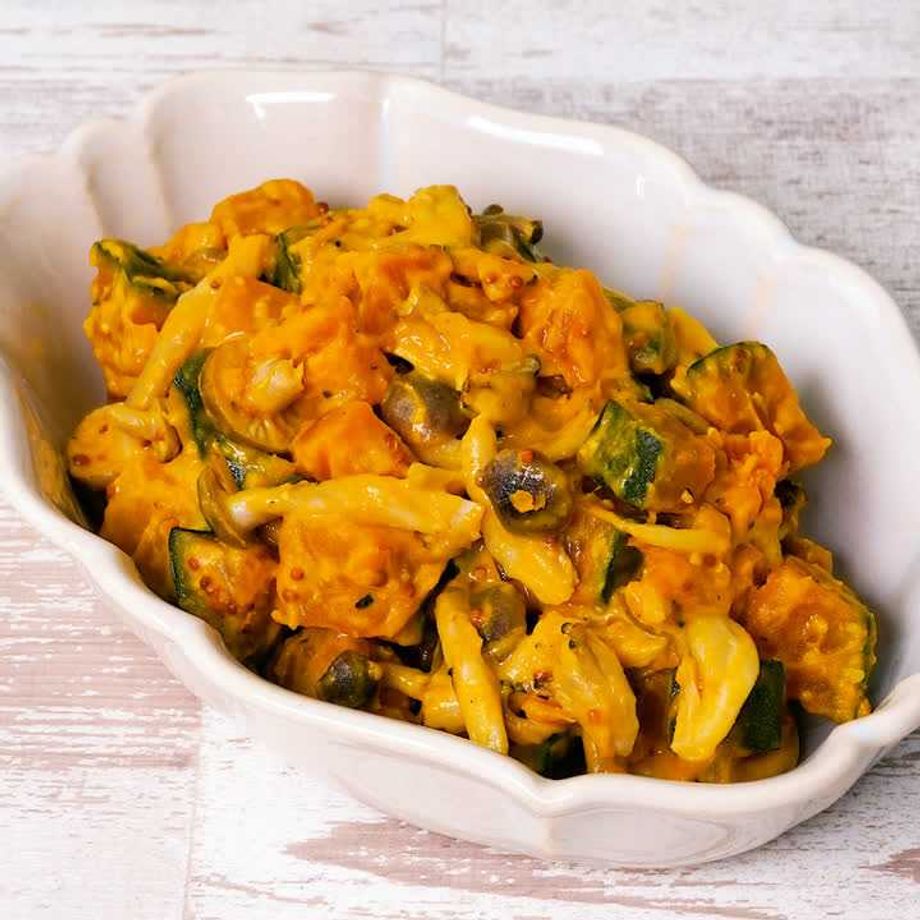 【1日目】寒い季節にぴったりの彩りサラダ♪ ほっくり甘いかぼちゃにしめじを合わせ、マヨネーズのコクとはちみつのやさしい甘さをプラスしました。粒マスタードの爽やかな酸味がほどよいアクセントになり、濃厚ながらも後味すっきりと楽しめる一品です。 【本レシピはプレミアム献立用レシピです】プレミアム献立は管理栄養士が栄養バランスや塩分量を計算して、食のプロが献立を作成しています。主菜、副菜、汁物が揃ったプレミアム献立で本レシピを作るとより美味しく食べることができます。ぜひプレミアム献立で献立内容をチェックしてみてください。