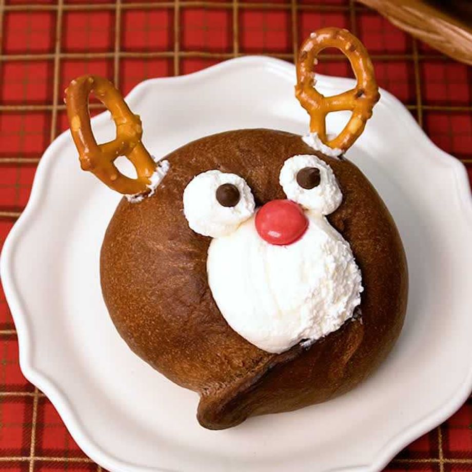 むっちりベーグルにクリームをのせ、プレッツェルでツノをつけたらトナカイに大変身! 赤いお鼻とつぶらな瞳がかわいい♪クリスマスパーティーにぴったりな映えスイーツです!手作りならではの表情の違いも楽しめます。