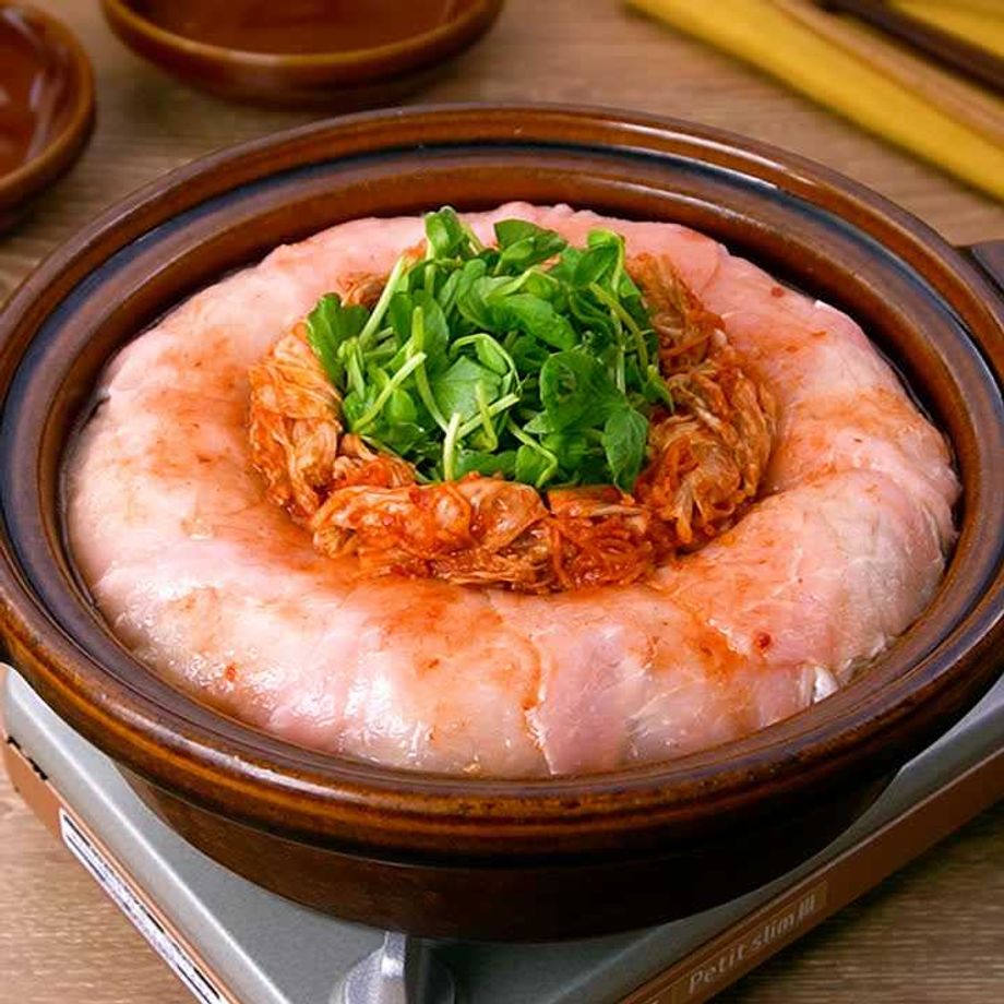 豚肉を覆うように巻く。中央にうどんを詰め、キムチ鍋スープを加える。豆苗をのせ、豆苗の周りにキムチをのせる。