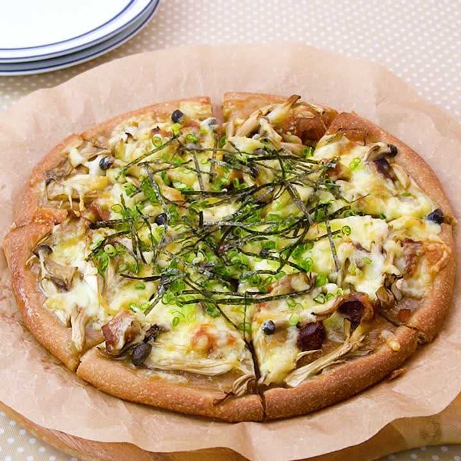 全粒粉を混ぜたピザ生地は香りがよく、噛むほどに小麦本来の甘みを感じます。焼き鳥缶を使って照り焼き風味を再現しました!きのこはお好きなものを組み合わせてお作りください♪