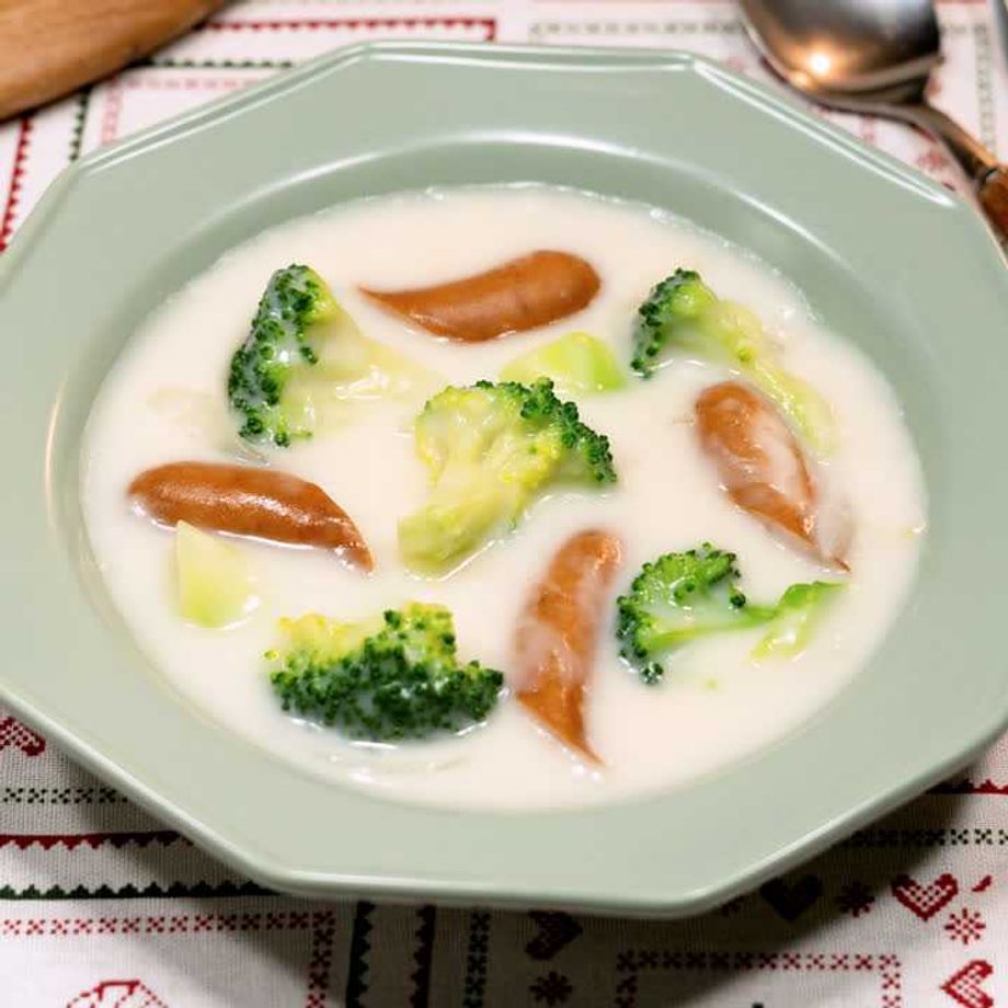 鍋にバターを入れて中火で熱し、玉ねぎ、ソーセージ、ブロッコリーを入れて玉ねぎがしんなりするまで炒める。水を加えて煮立たせ、弱火で2分ほど煮る。