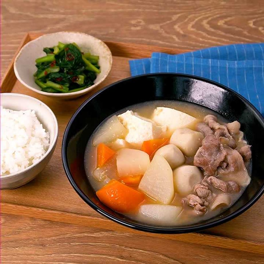 豚汁がメインの献立はいかがですか♪具材は大きめにカットし、食べ応えのある豚汁に仕上げます。副菜はポリ袋に入れて揉み込むだけなので先に準備してから豚汁の調理に取りかかりましょう!【減塩対策対応レシピ】※減塩対策についてはQ&Aをご参照ください。
