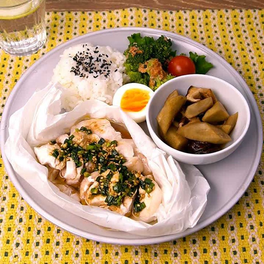 器にごはんを盛り、しいたけごぼう、ブロッコリーおかかマヨ、ゆで卵を等分にのせる。鶏肉のクッキングシートを開いてのせ、たれを半量かける。同様に計2つ作る。