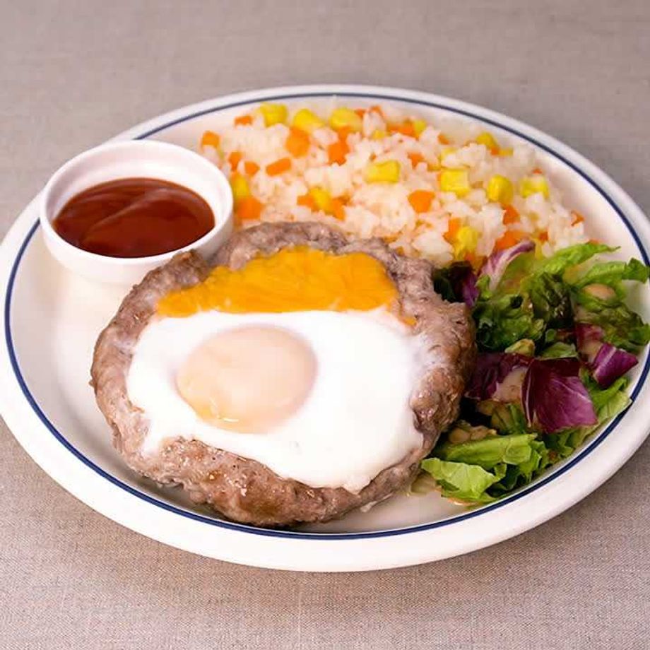 SNSで話題の巣篭もりハンバーグを献立でご紹介♪トマト・玉ねぎ・チェダーチーズ・卵入りのハンバーグは食べ応え抜群!クッキングペーパーに包んでフライパンで蒸し焼きにするので、ふっくらジューシーに仕上がります。にんじんとコーン入りのライスで彩りも◎【減塩対策対応レシピ】※減塩対策ついてはQ&Aをご参照ください。
