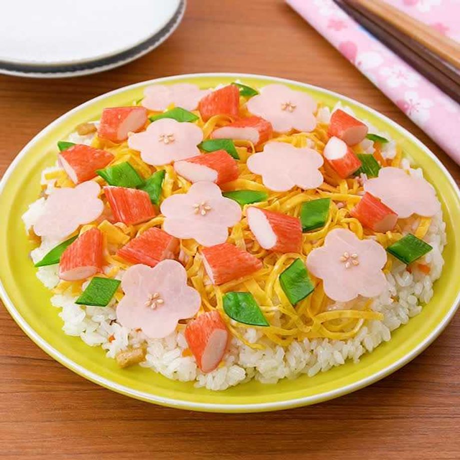 いつものちらし寿司を花型で抜いたハムでおめかし♪彩りも華やかで、イベントやおもてなしにもおすすめです。