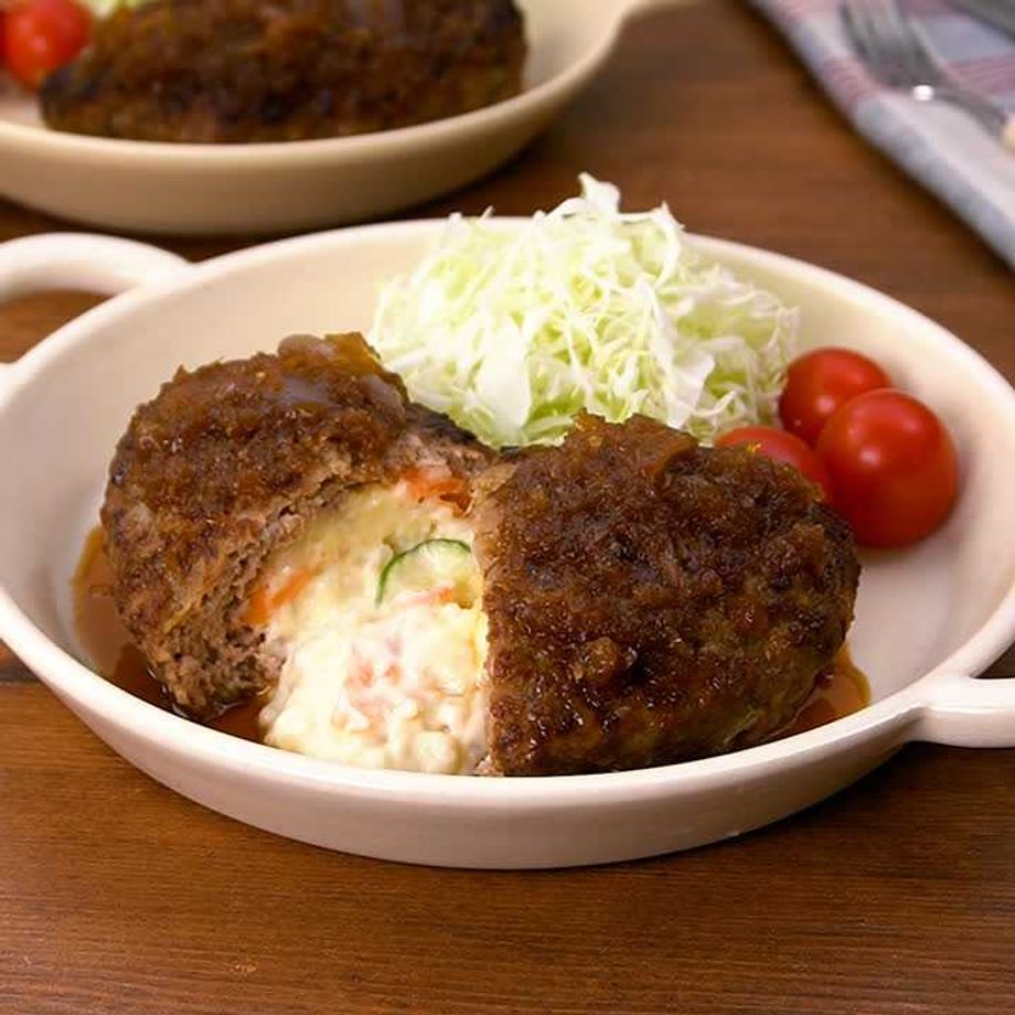 ポテトサラダを詰め込んだ食べ応え満点のハンバーグをご紹介♪ラップを使って成形すると上手に包めるのでおすすめです。【減塩対策対応レシピ】※減塩対策についてはQ&Aをご参照ください。