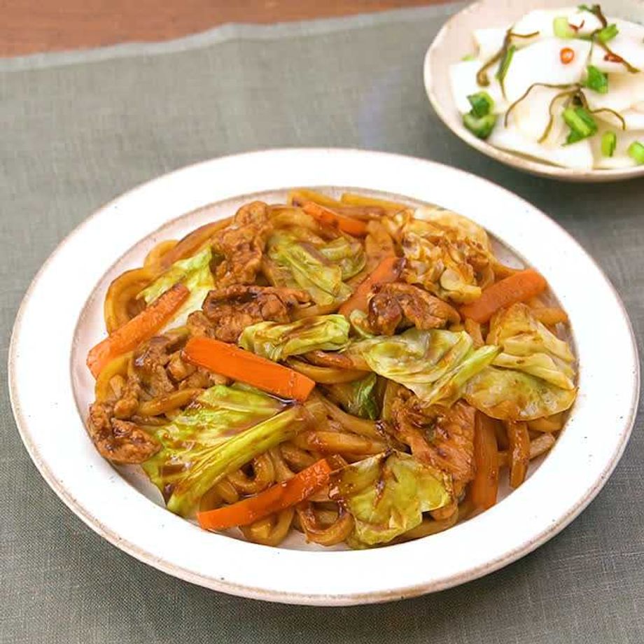 赤味噌のコク深い味わいがうどんに絡む、濃厚みそ焼きうどん。キャベツの甘みと豚こまの旨みが合わさり、満足感のある一皿です。副菜には、箸休めにぴったりなかぶのさっぱり漬けを合わせました。【減塩対策対応レシピ】※減塩対策ついてはQ&Aをご参照ください。