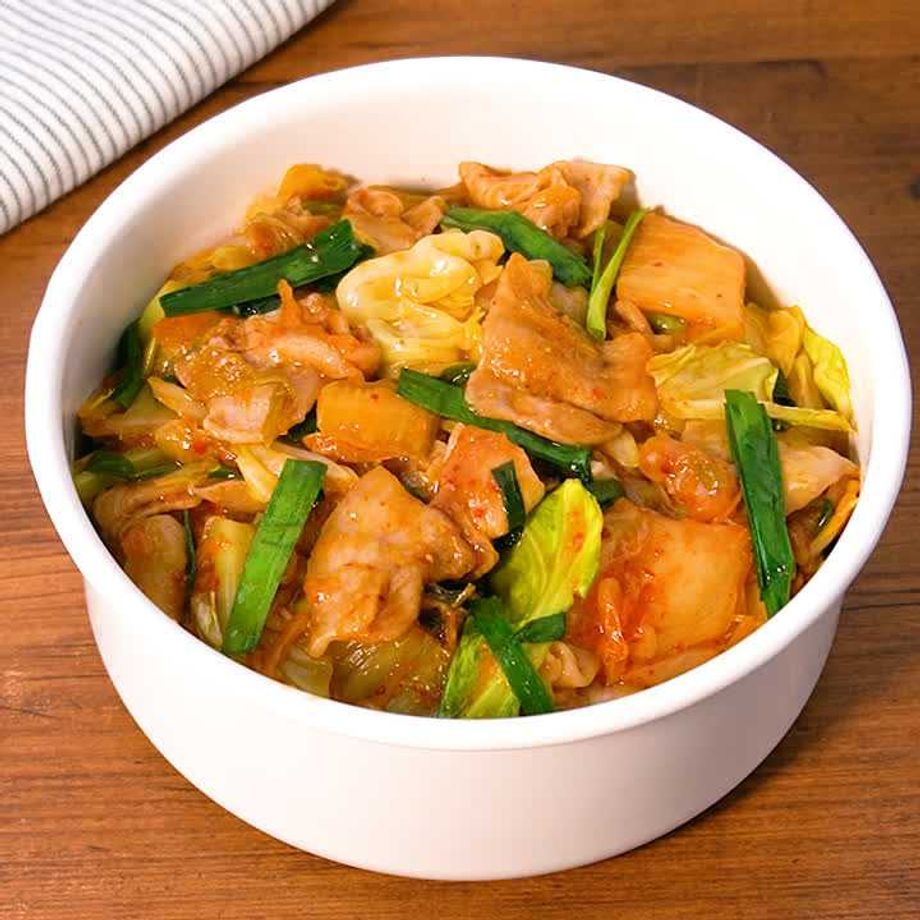 【冷蔵3日/冷凍14日】キャベツ、ニラ、豚バラで作る旨辛豚キムチのご紹介!ごま油の香り×キムチの旨辛で、白ごはんが止まらない一品です♪