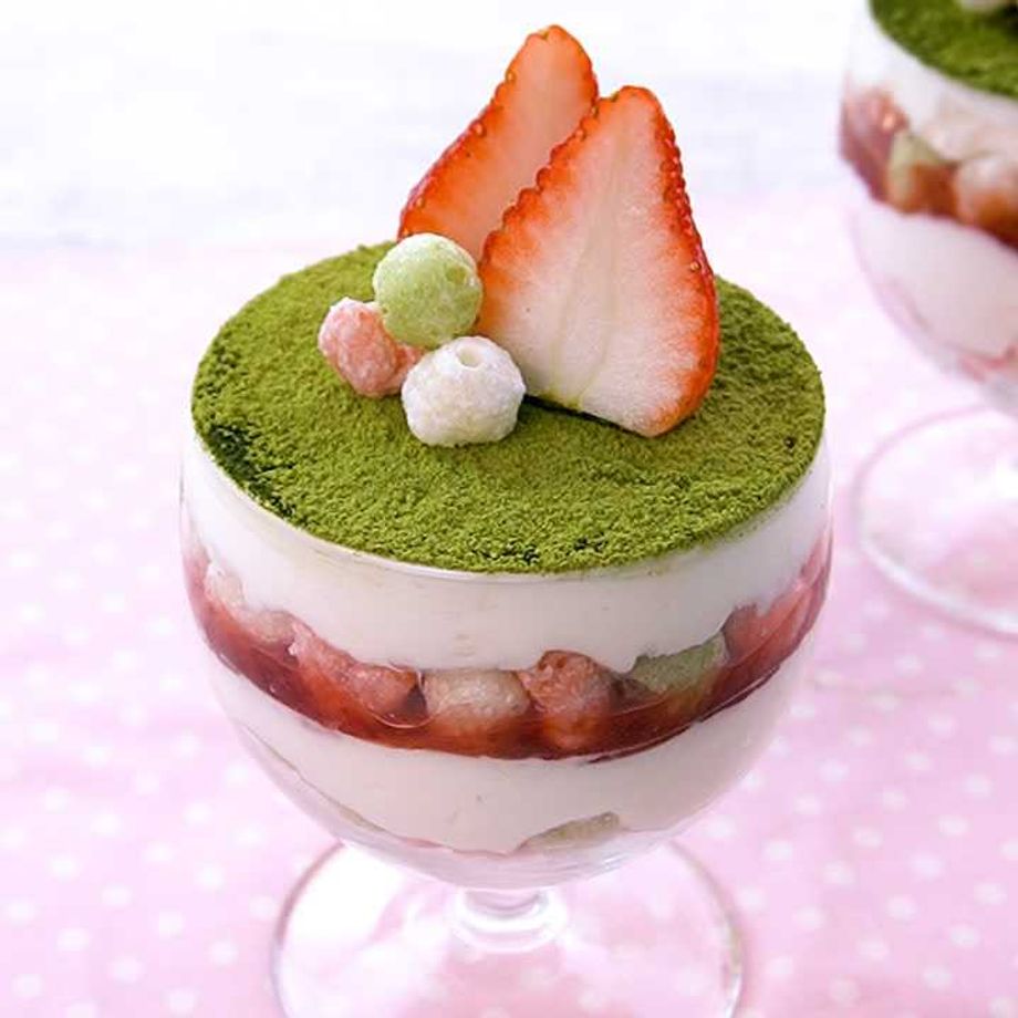 抹茶を振り、いちご、ひなあられ(仕上げ)をのせる。