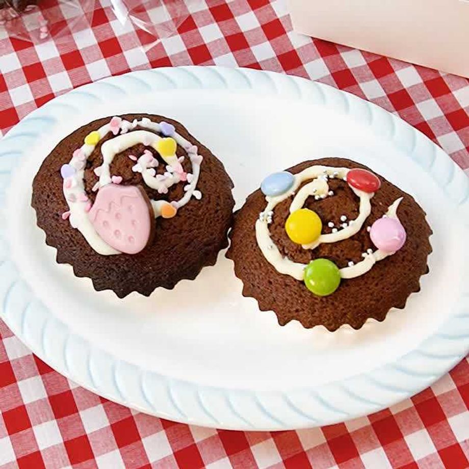 ココア生地のマドレーヌにカラフルなチョコをのせて可愛く仕上げました♪生地はチョコ不使用でもしっとり濃厚な美味しさです。ホットケーキミックスを使って気軽に作れるのも嬉しいポイント!