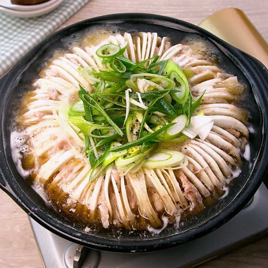 薄く切った大根と豚バラ肉を交互に並べて詰め込みます!おいしいだけじゃなくて見た目も華やかで嬉しいおもてなし鍋♪仕上げのねぎはたっぷり入れるのがおすすめです。