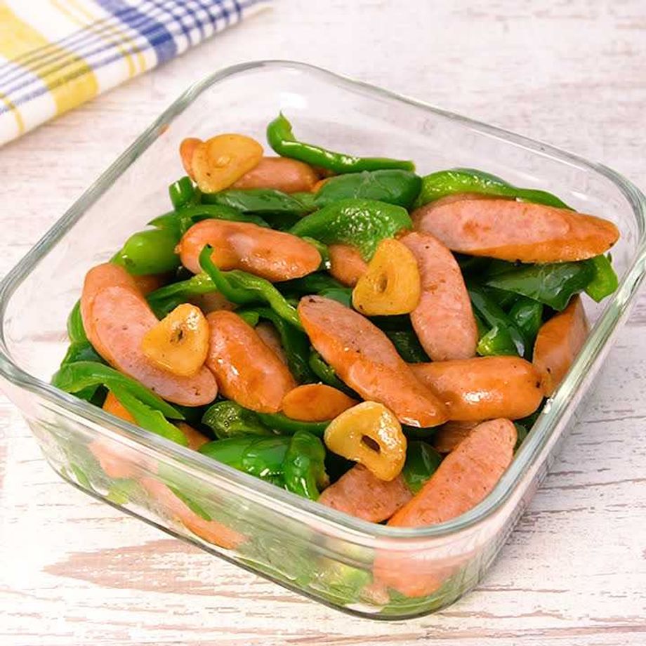 【冷蔵4日/冷凍14日】ピーマンとソーセージをさっと炒めた、ガーリック香る簡単おかず♪にんにくの風味とソーセージの旨みで、手軽なのに満足感のある一品です。