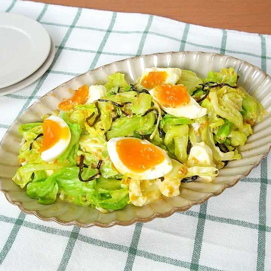 キャベツとゆで卵の塩昆布マヨサラダ