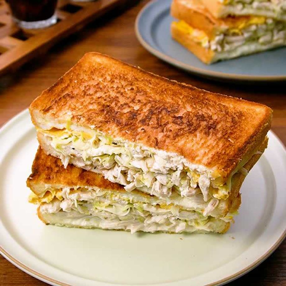 鶏むね・キャベツ・卵、具材をたっぷり挟んだホットサンドをご紹介♪マヨネーズで和えた具材がジューシーな鶏むねと相性抜群!朝食やランチにぴったりの一品です。